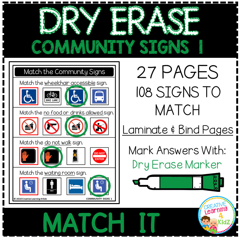 Teach real-world awareness with this Community Signs Match-It Dry-Erase Workbook!