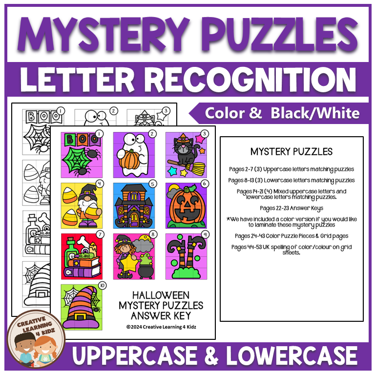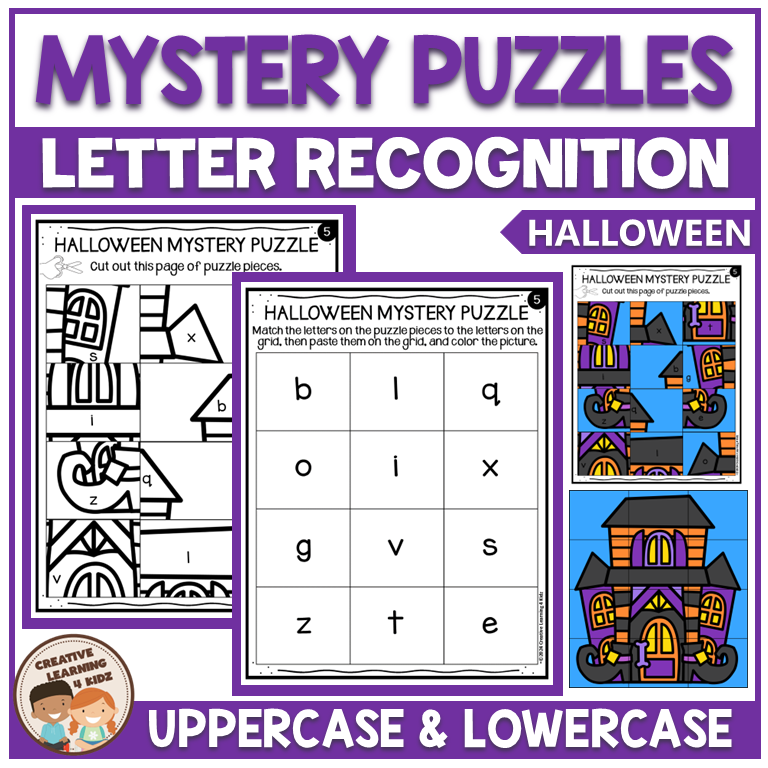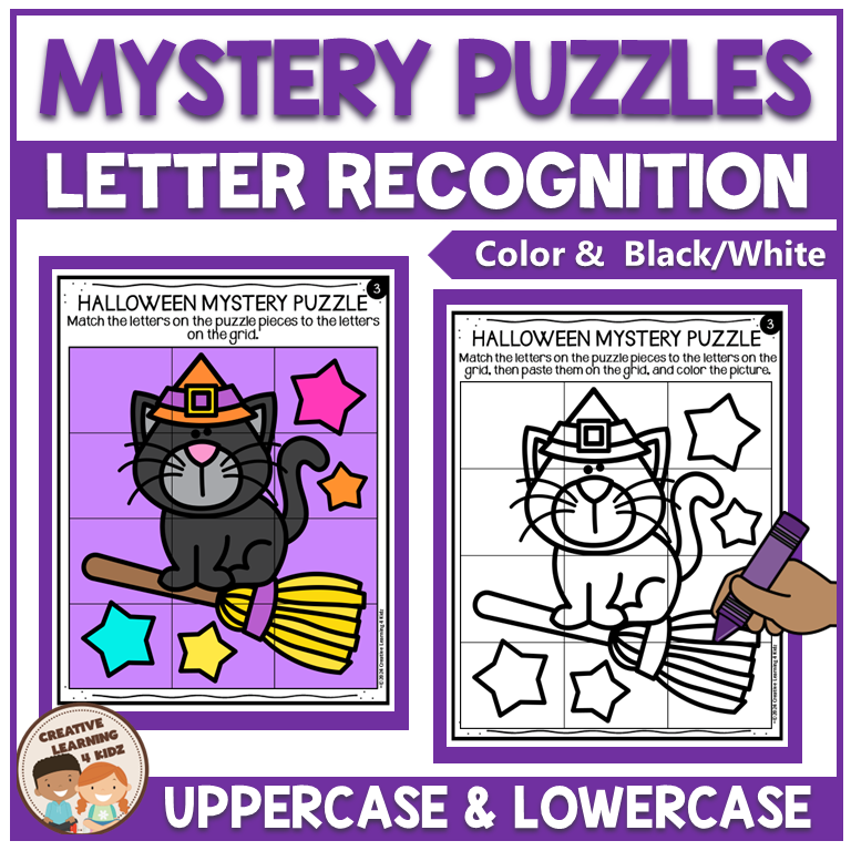 These no-prep Halloween-themed alphabet matching mystery puzzle worksheets can be used as extra practice, letter review, morning work, sub tubs, centers, small groups, or for fast finishers, homework, and more!