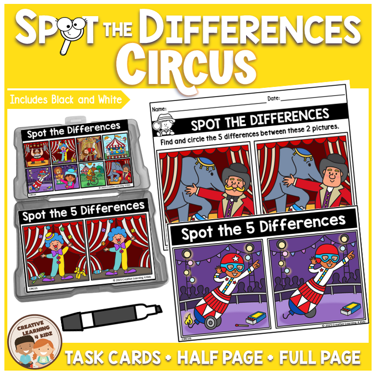 Keywords: Circus, spot the differences, critical thinking, observation skills, task cards, printable, fine motor, preschool, kindergarten, first grade, classroom activity, visual discrimination, circus theme, problem solving