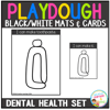 The set features 8 dental-themed designs including a toothbrush, cup, dental floss, mouthwash, toothpaste on a toothbrush, smile, toothpaste tube, and tooth. Both full-color and black & white versions of the playdough mats and visual cards are included, offering versatile options for printing and classroom use.