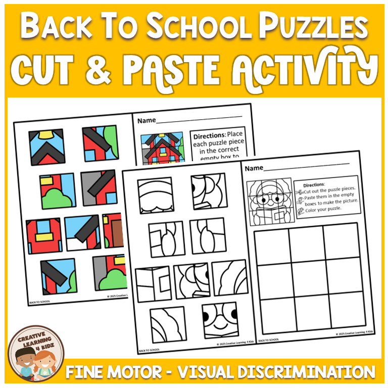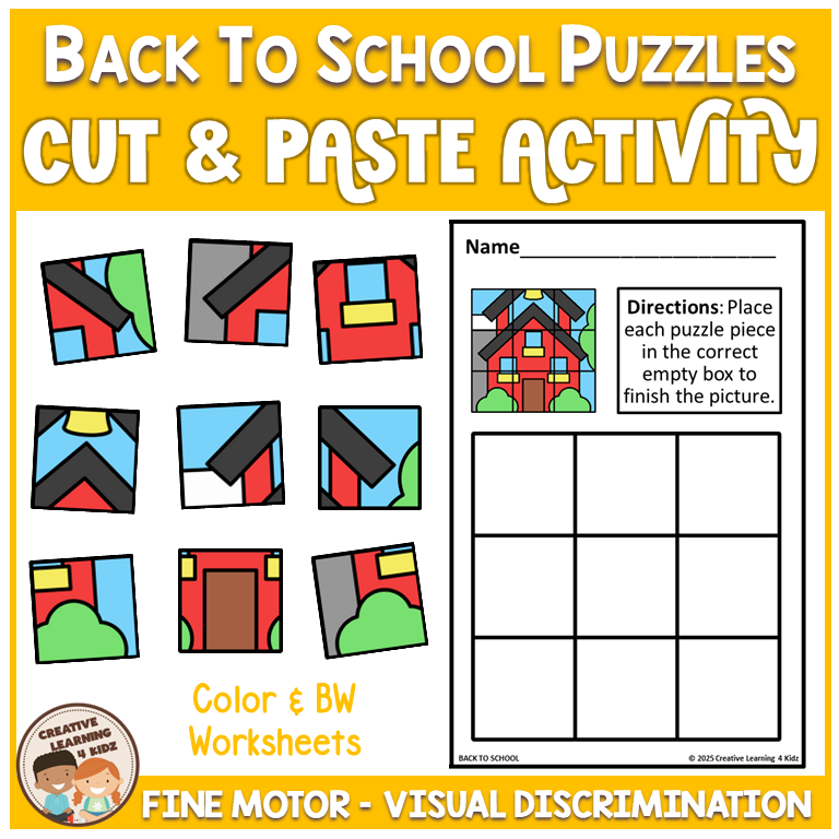 Keywords: Back to school puzzles, Cut and paste worksheets, Fine motor school skills, Preschool school puzzles, Kindergarten back to school, Visual discrimination game, Problem solving puzzles, School cut paste centers, Hands on school activity, Critical thinking skills, OT fine motor practice, Back to school pack, Classroom puzzle mats