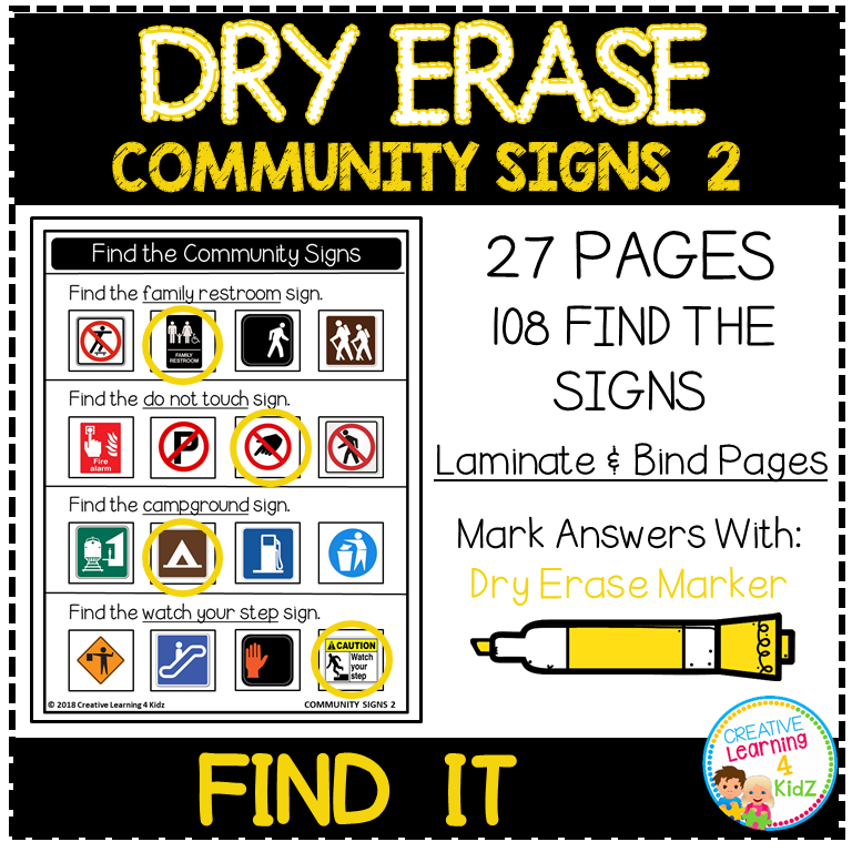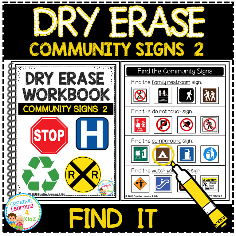 Help kids connect words to real-world visuals with this Community Signs Workbook 2 – “Find It” Dry Erase Edition!