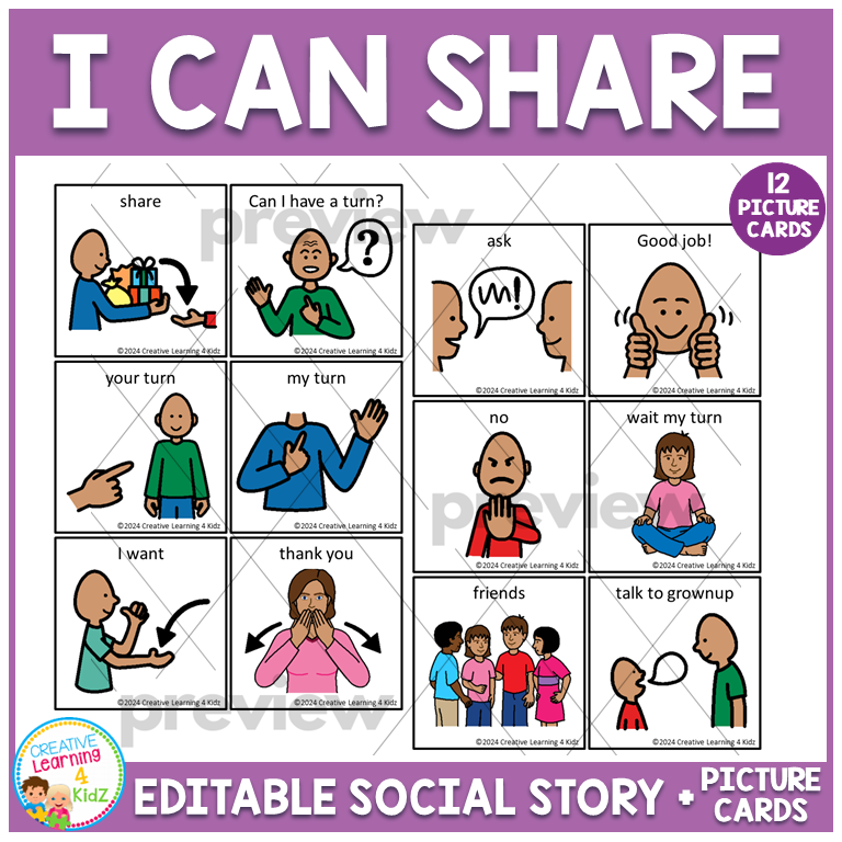 We have also included 12 picture cards that you can laminate and put on a ring to use as a visual reminder for sharing.