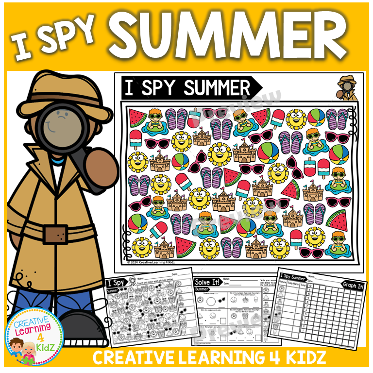 Keywords: summer math games, i spy summer fun, visual search sheets, preschool summer pack, tally and graph game, summer number work, counting worksheets, addition activity, early math practice, homeschool summer set, summer logic task, number graphing game, printable I spy fun