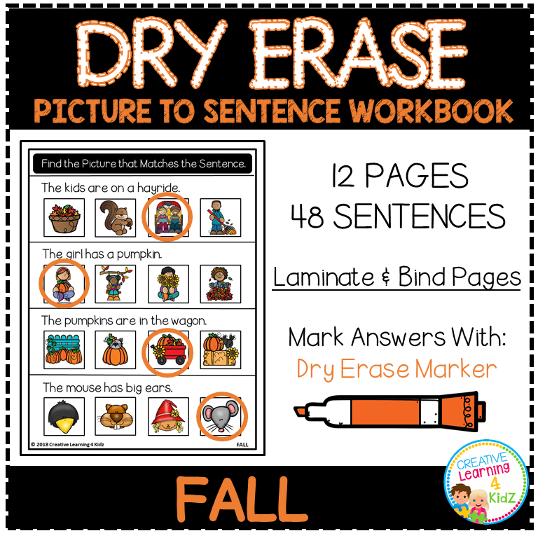 Keywords: fall reading comprehension activity, dry erase sentence matching, picture to sentence fall worksheets, preschool fall literacy center, kindergarten reading fall theme, ESL fall reading activity, fall special education resource, reusable autumn workbook, early reader sentence match, visual sentence matching fall