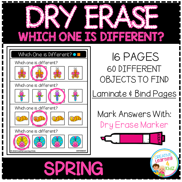 Keywords: spring activity book, dry erase workbook, odd one out game, preschool spring fun, visual match game, printable workbook, reusable worksheets, spring logic game, homeschool activity, spot the difference, spring dry erase, critical thinking, fun spring activity