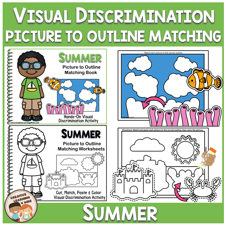 Keywords: Summer matching mats, Picture to outline match, Visual discrimination, Fine motor worksheets, Preschool summer set, Kindergarten summer, Special education task, File folder activities, Interactive matching book, Summer cut and paste, Cutting and gluing skills, Spatial awareness skills, Hands on summer centers