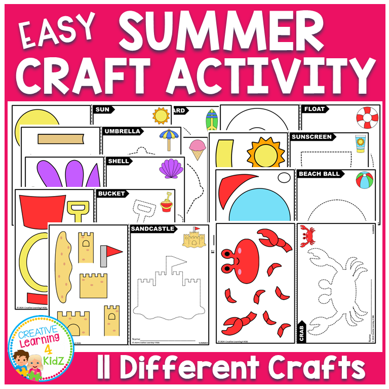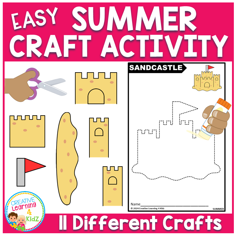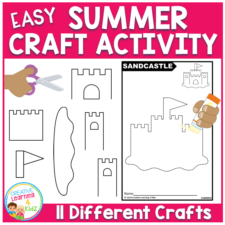 Keywords: summer crafts, cut and paste, craft activity, kids worksheet, fine motor skills, sandcastle craft, crab craft, seashell craft, sun craft, preschool fun, printable art, classroom craft, summer theme, beach activity, indoor craft, creative play, hands-on fun, art project, color and cut, summer learning.