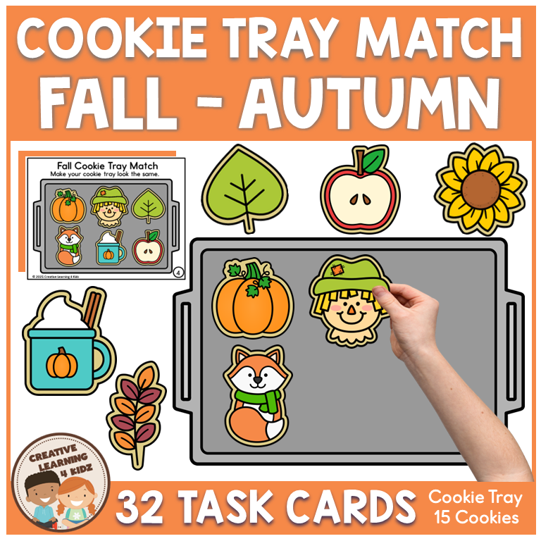 Students use 15 themed fall cookies to recreate designs shown on 32 task cards using their own cookie tray mat. Each cookie appears 11–12 times across the set, providing balanced and repeated matching practice with fresh challenges every time. This activity is perfect for fall centers, morning tubs, small groups, or fine motor stations.