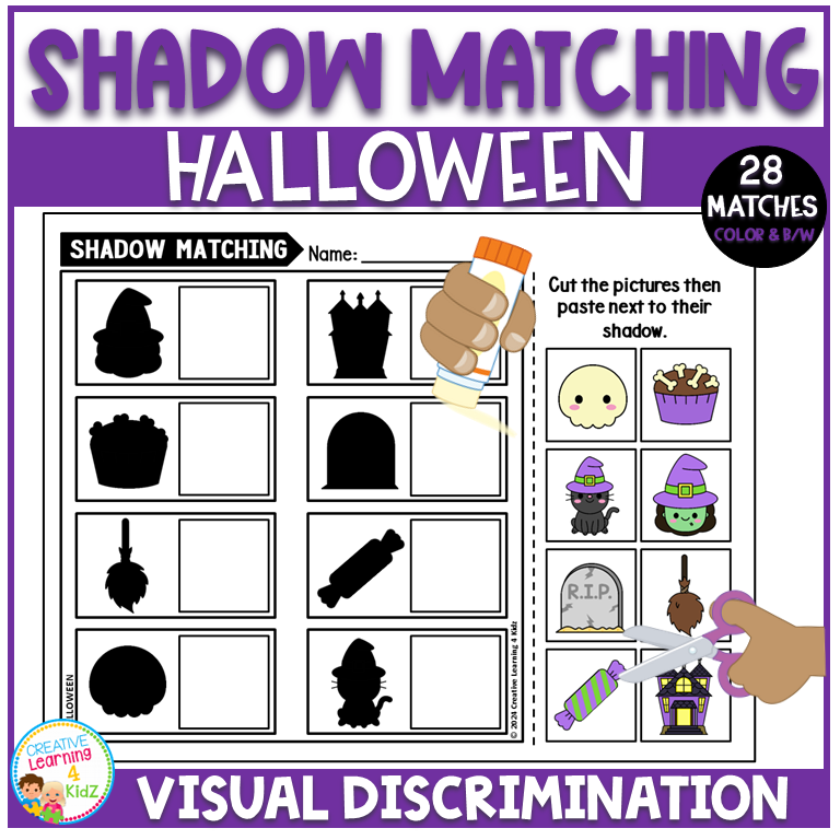 Our Halloween Shadow Matching Cut and Paste Worksheets are an excellent tool for enhancing visual discrimination skills in children. Visual discrimination is the ability to differentiate between objects based on their distinctive characteristics, such as shape, size, and details.