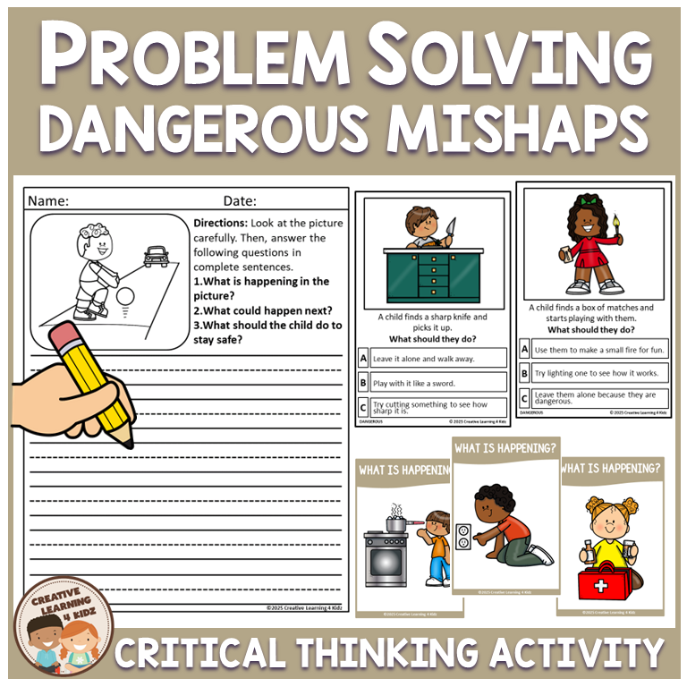 Help your students learn about safety awareness and problem-solving with this engaging Dangerous Mishaps resource! This set includes task cards, writing prompt worksheets, and discussion flashcards designed to encourage critical thinking about real-life dangers children may encounter.