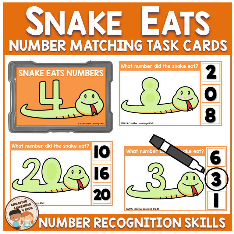 Keywords: snake eats numbers, number recognition, preschool numbers, kindergarten numbers, numbers 1-20, math task cards, early math skills, visual discrimination, critical thinking, classroom math, homeschool numbers, small group math, counting practice.