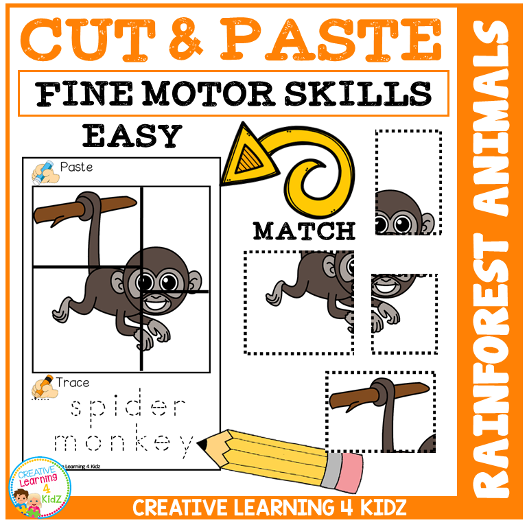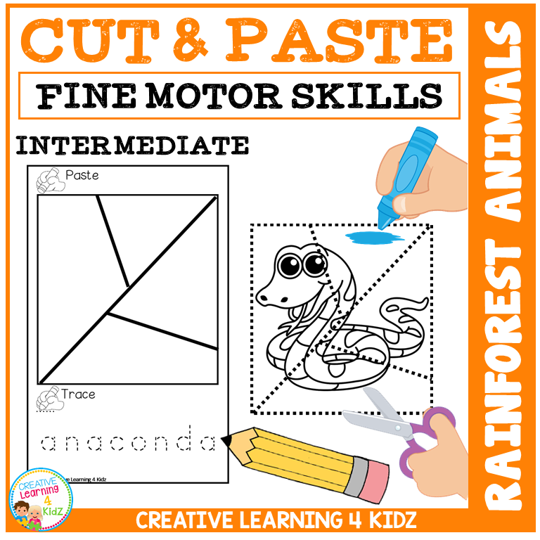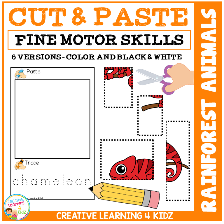 This rainforest animal cut-and-paste set combines engaging visuals with essential skill-building. With 120 puzzles across 6 differentiated versions, children can strengthen their fine motor control through scissor work, pasting, tracing, and coloring—all while learning about rainforest creatures!