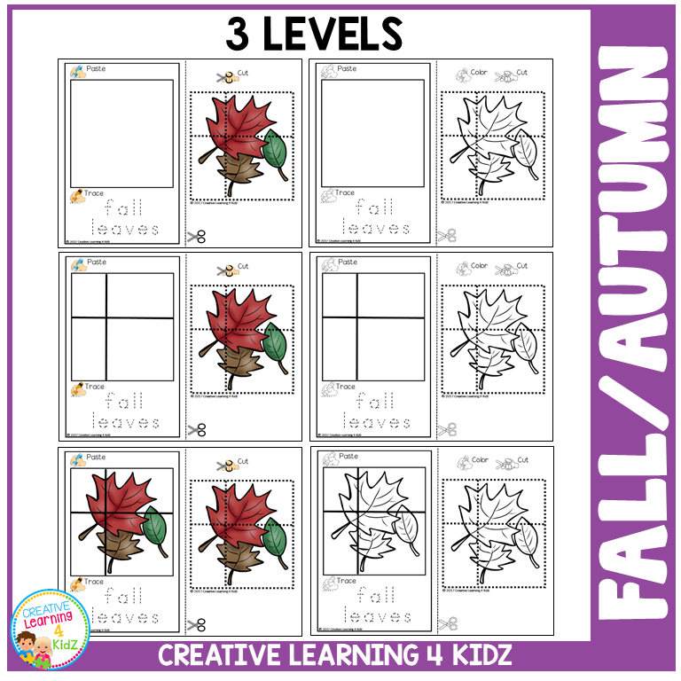 This fall/autumn-themed cut-and-paste worksheet set helps kids build scissor control, hand strength, and word recognition while exploring seasonal themes. With 246 total puzzles across 6 differentiated versions, it’s perfect for September through November learning.