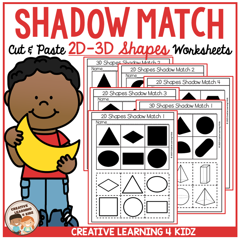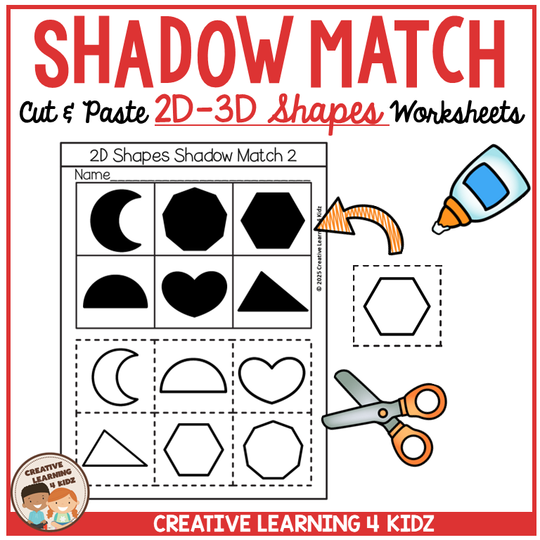 Keywords: Shape Matching, 2D Shapes, 3D Shapes, Visual Discrimination, Fine Motor Skills, Shape Recognition, Cut and Paste, Preschool Math, Kindergarten Worksheets, Hands-On Learning, Spatial Awareness, Motor Skill Practice, Print and Go.