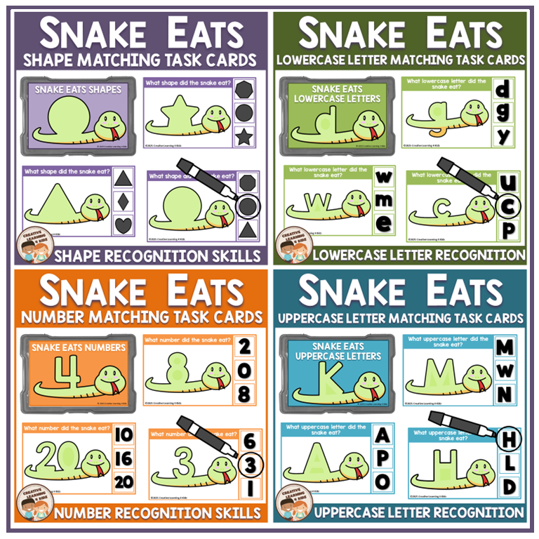 Snake Eats Bundle – Shapes, Numbers, Uppercase & Lowercase Letters Task Cards