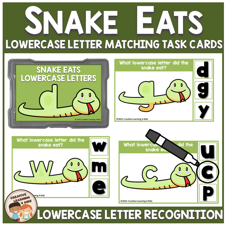 - Snake Eats Lowercase Letters – 26 full-color task cards (prints 2 per page)