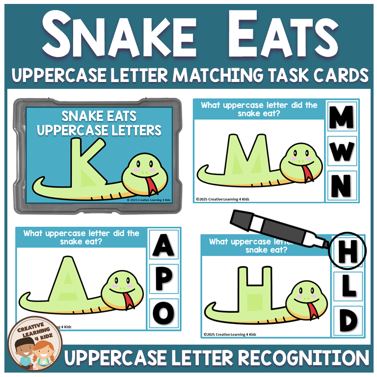 - Snake Eats Uppercase Letters – 26 full-color task cards (prints 2 per page)