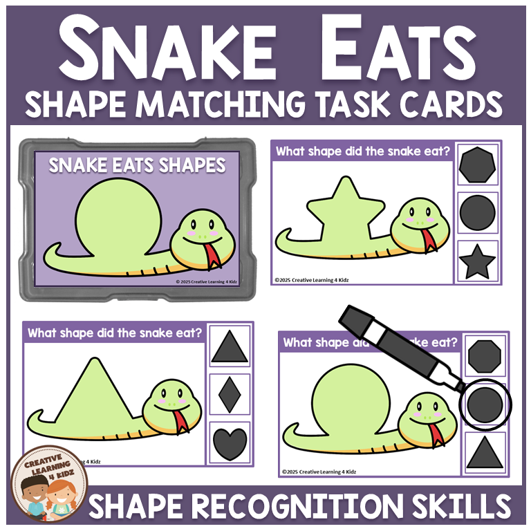 - Snake Eats Shapes – 18 full-color task cards (prints 2 per page)