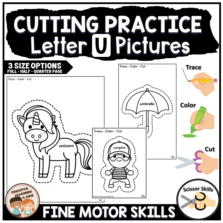 Our Letter "U" Cutting Practice Worksheets come in three convenient sizes, perfect for any classroom setting: