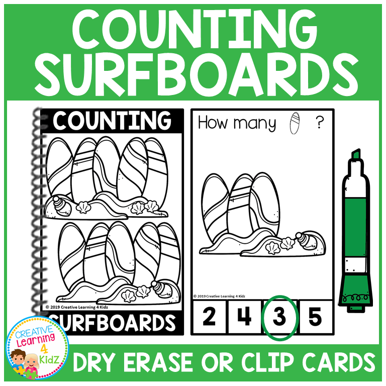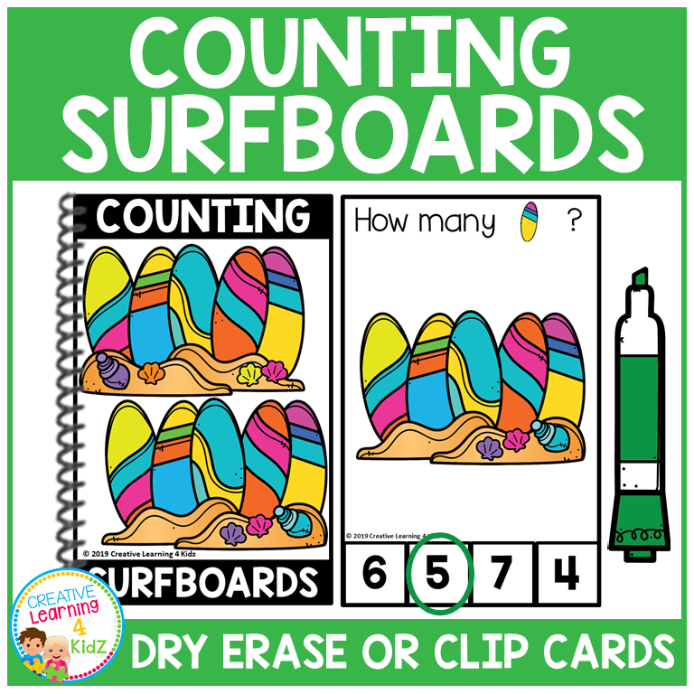 Each half-page card features colorful surfboards with countable decorations, giving kids a hands-on way to connect numbers to quantities. Use them as clip cards, dry erase cards, or bind them with the included cover to create a reusable counting book.