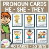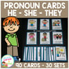 This set includes 90 cards (30 sets), each with three images (he, she, and they) showing the same action. Learners select the correct pronoun to complete the sentence based on the image shown.