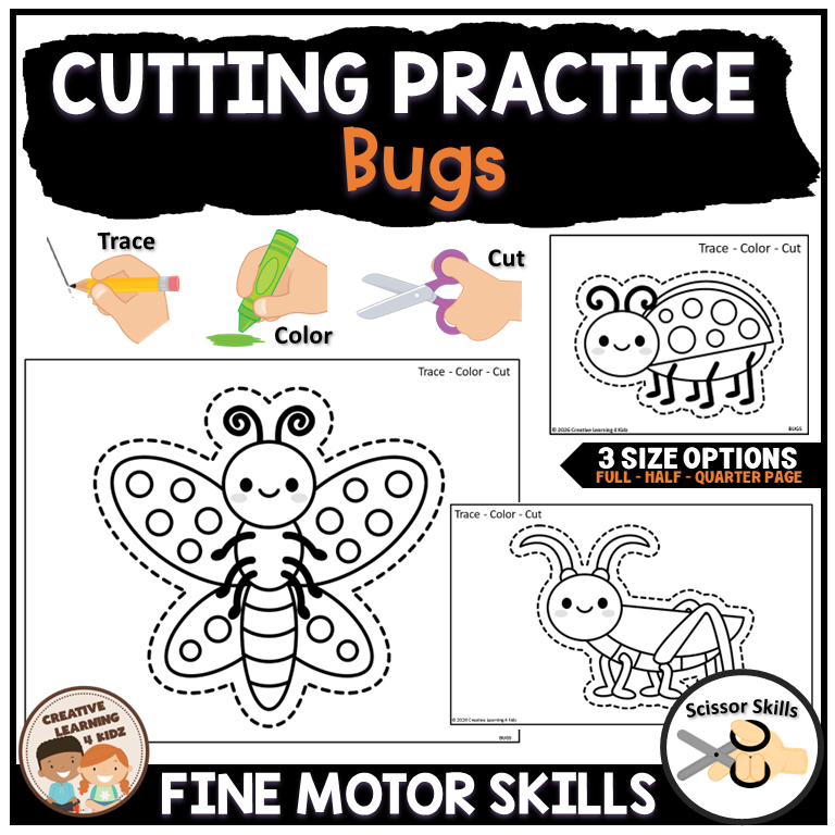 Each worksheet begins with tracing easy-to-follow lines around a variety of friendly bugs such a butterfly, ladybug, bee, ant, caterpillar, and more. Tracing helps strengthen pencil control and hand-eye coordination, preparing children for successful cutting.