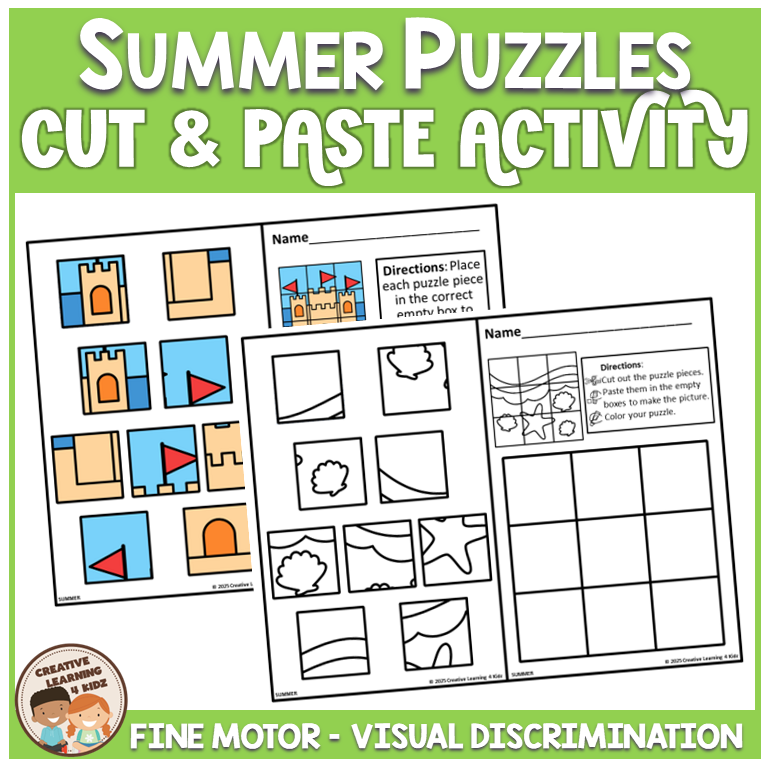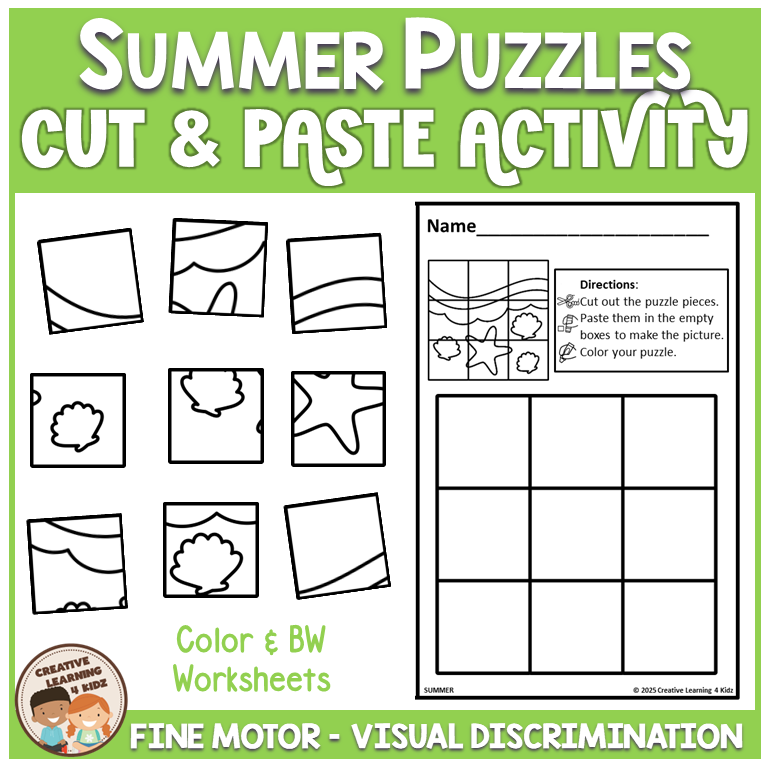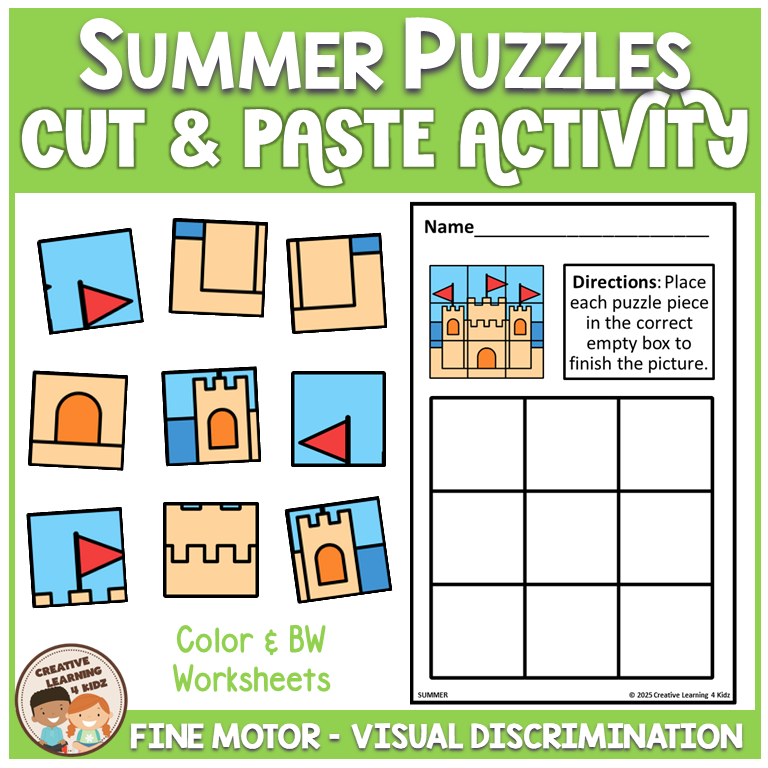 Keywords: Summer puzzle worksheets, Cut and paste activities, Fine motor summer fun, Preschool summer puzzles, Kindergarten cut paste, Visual discrimination game, Problem solving puzzles, Summer cut paste mats, Hands on summer activity, Critical thinking summer, OT fine motor practice, Summer worksheet pack, Seasonal classroom fun
