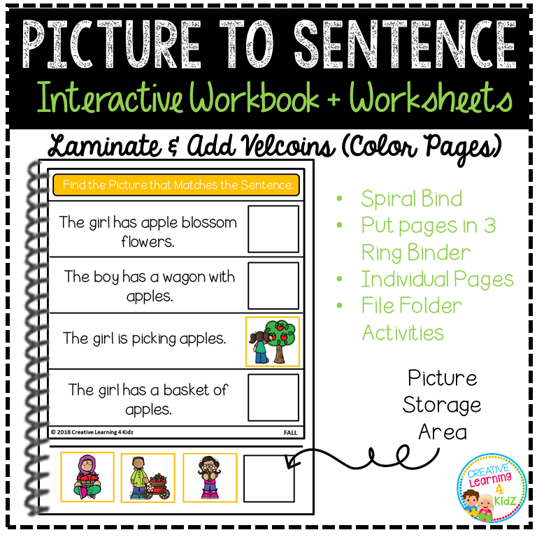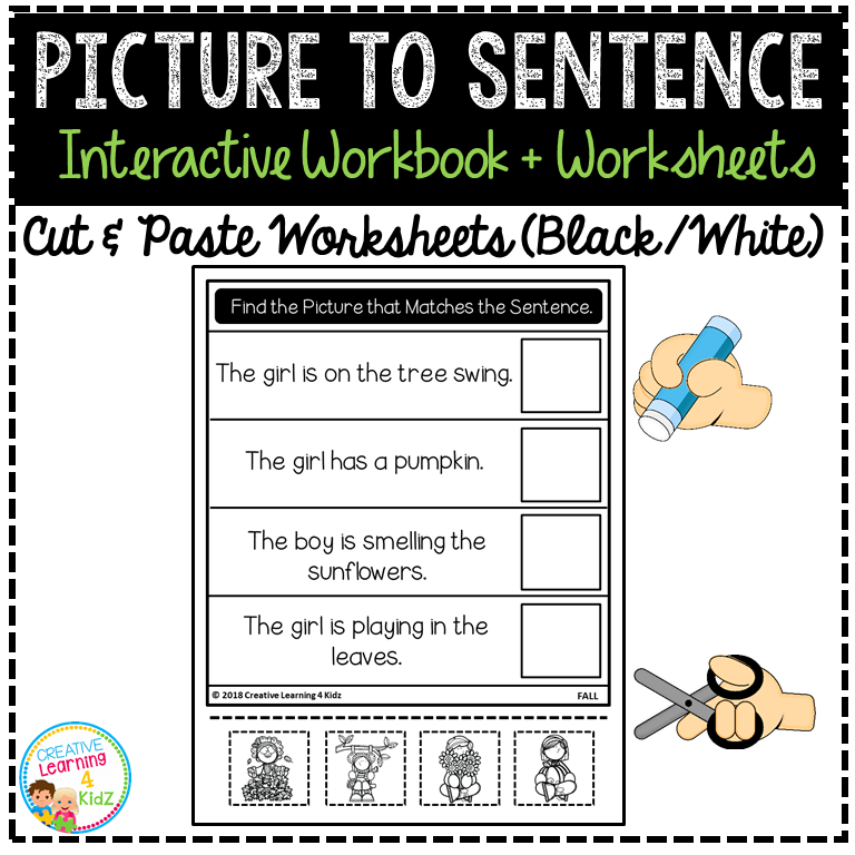 This printable workbook includes 12 engaging sentence‑picture matching worksheets in both color and black & white formats, designed to reinforce fall-themed vocabulary, sentence structure, and visual discrimination.