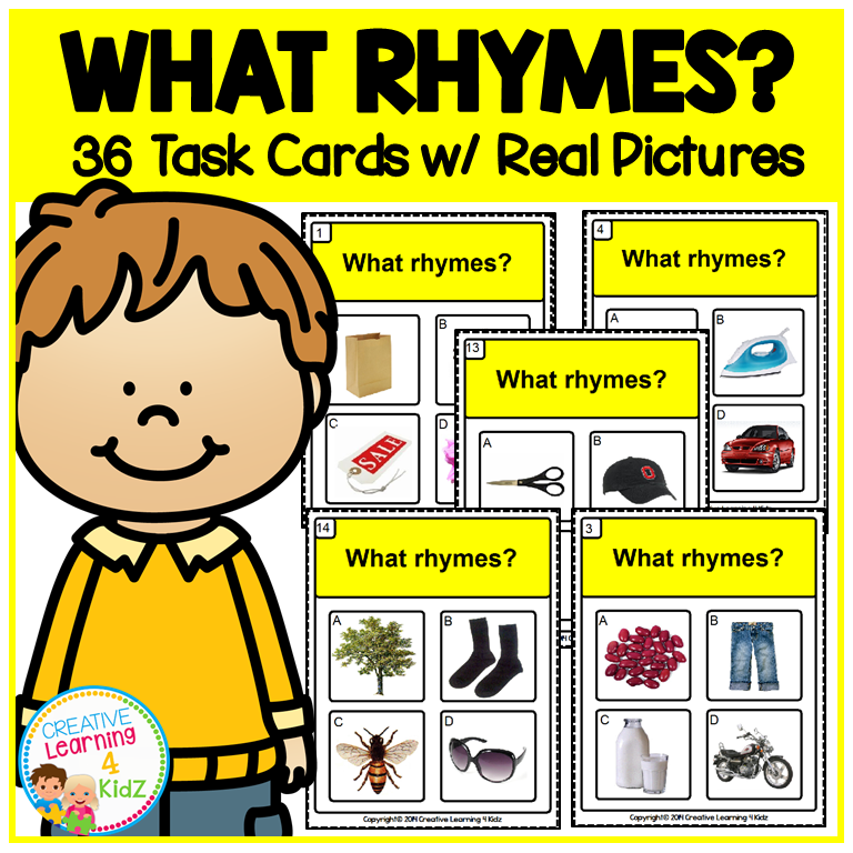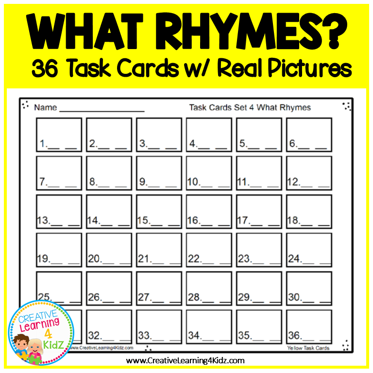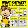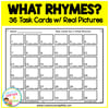 - 36 Task Cards – Each card presents four picture choices, with two that rhyme.