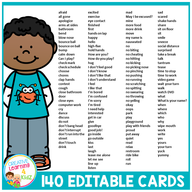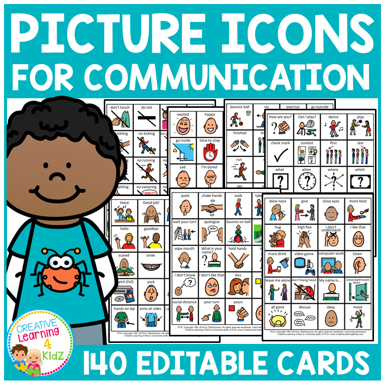 - 140 Picture Icons (2” x 2”) – Editable Text