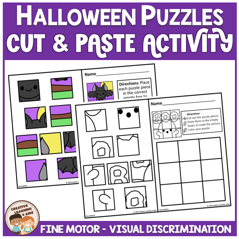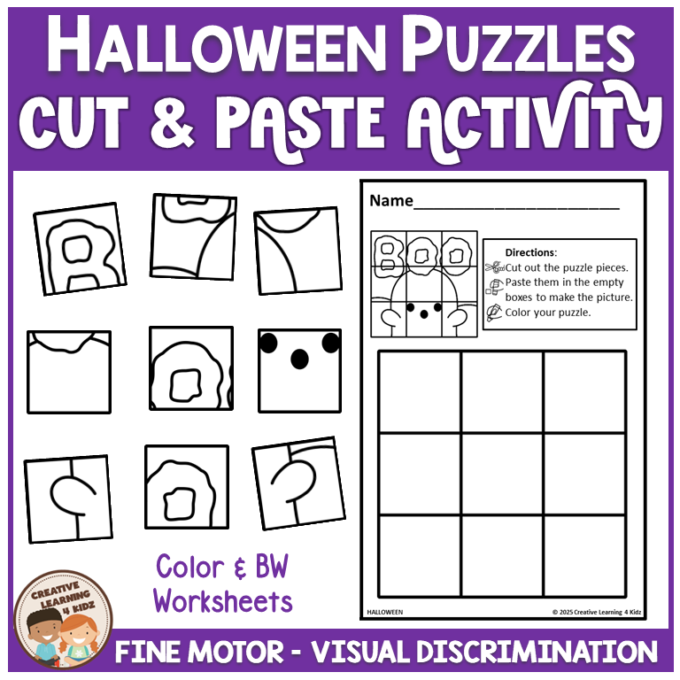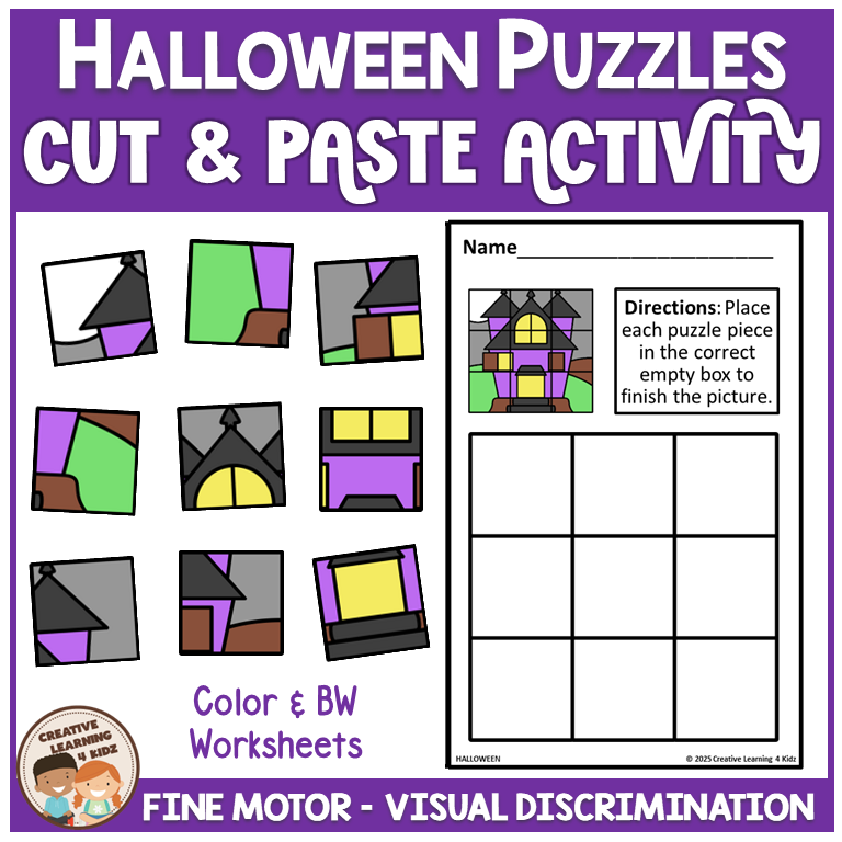 Halloween Cut and Paste Puzzle Worksheets | Fine Motor & Visual Discrimination