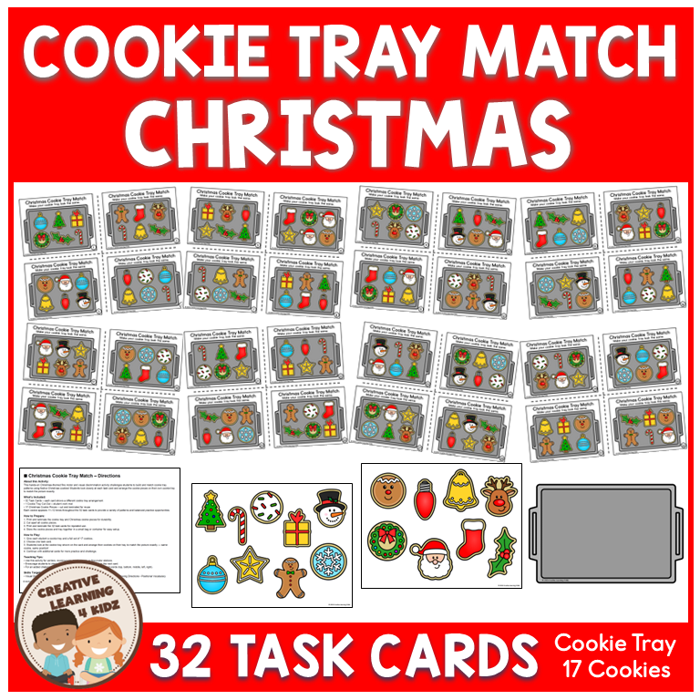 Students use 17 themed Christmas cookies to recreate designs shown on 32 task cards using their own cookie tray mat. Each cookie appears 11–12 times across the set, providing balanced and consistent matching practice with new challenges every time. This activity is perfect for December centers, morning tubs, small groups, or fine motor stations.