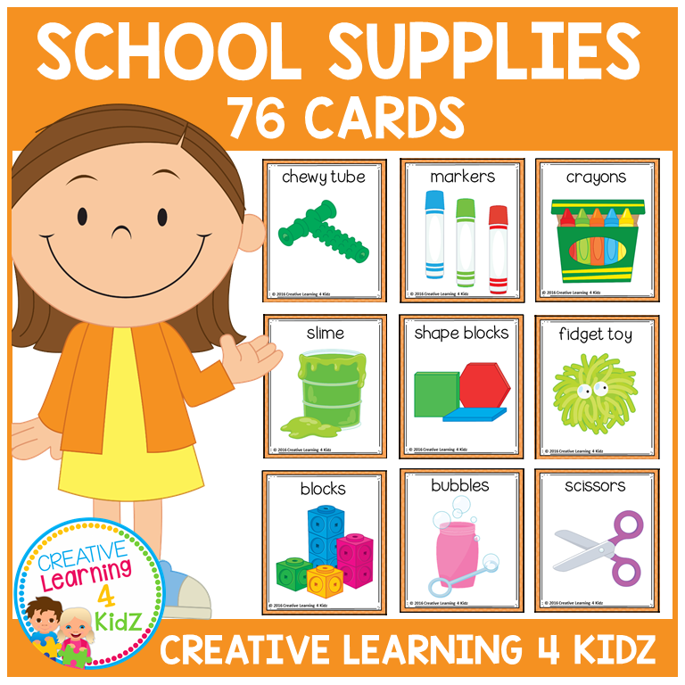 Complete List of Cards: slime, bungie cords, modeling clay, fidget toy, bean bag, chewy tube, bubbles, wind up toy, hand mirror, playdoh, shaving cream, tongue depressors, mini flashlight, crayons, markers, colored pencils, daubers, paper folder, notebook, labels, puzzle, shape blocks, ink pad, white out, pencil grippers, letter blocks, sticky tac, cotton swab, backpack, battery, open binder, binder, blocks, calculator, compass, composition book, construction paper, counter chips, crayons, dice, dominoes, eraser, glue, glue stick, highlighter, laptop, lunchbox, magnify glass, watercolor paint, paint brush, paper bag, paper, paper clip, clothespin, pen, pencil, pencil case, pin, protractor, ring, ruler, scissors, pencil sharpener, stapler, sticker, sticky notes, stopwatch, tablet, tape, thermos, tissues, velcro, water bottle, wipes.