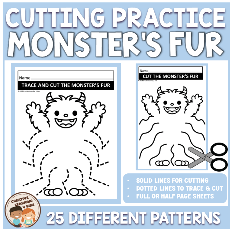 Whether learners are just beginning or more confident with scissors, these worksheets include solid cutting lines for direct scissor use and dotted tracing lines for students who benefit from tracing before cutting. Featuring one friendly monster with 25 unique fur pattern variations, children practice a variety of line types—straight, curved, wavy, and zigzag—while building precision, control, and confidence.