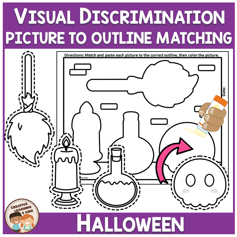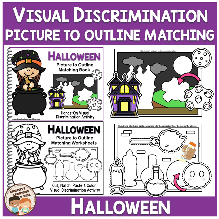 Keywords: Halloween matching mats, Picture to outline match, Visual discrimination, Fine motor worksheets, Preschool Halloween set, Kindergarten Halloween, Special education task, File folder activities, Interactive matching book, Halloween cut and paste, Spatial awareness skills, Cutting and gluing fun, Hands on Halloween centers