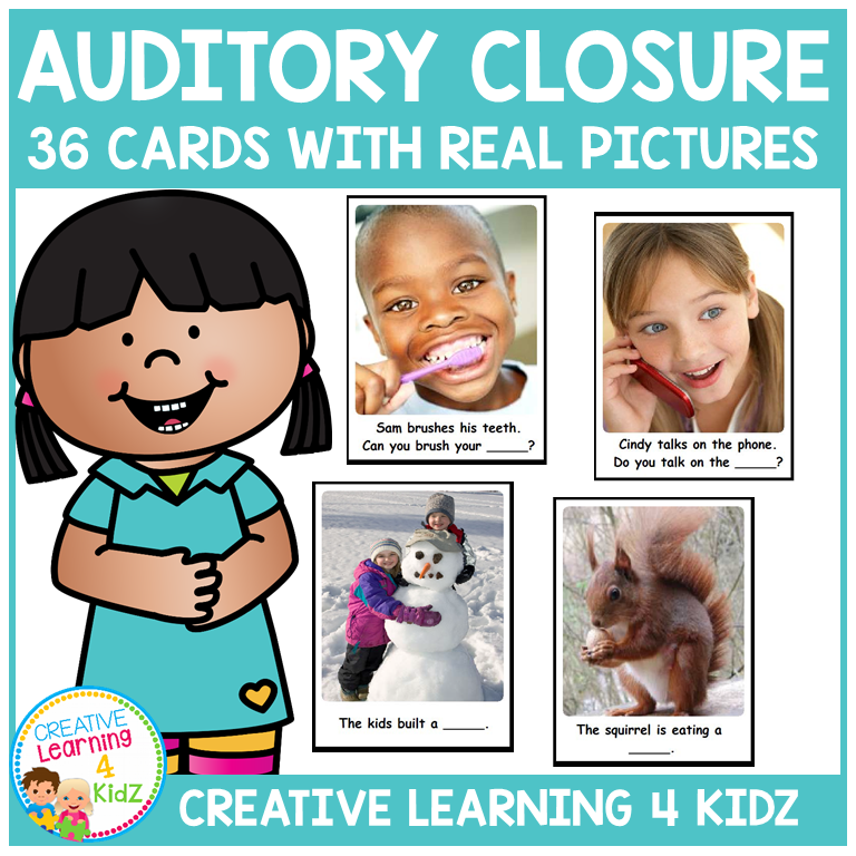 Keywords: auditory closure cards, speech therapy tools, real photo flashcards, listening skills game, language task cards, sentence completion, word retrieval game, speech cards kids, early language skills, auditory processing, listening activity, speech and language, special ed speech