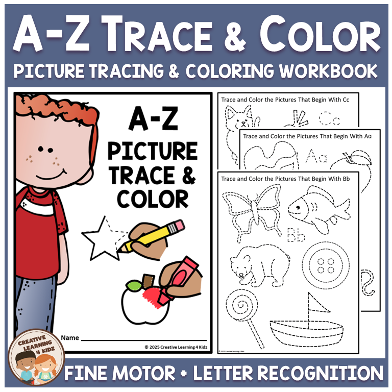 Make alphabet learning fun with this Alphabet Picture Trace and Color Workbook, a hands-on resource designed to build letter recognition, beginning sounds, and fine motor skills. Students will trace and color pictures that start with each letter from A–Z, reinforcing both visual recognition of letters and their corresponding sounds.