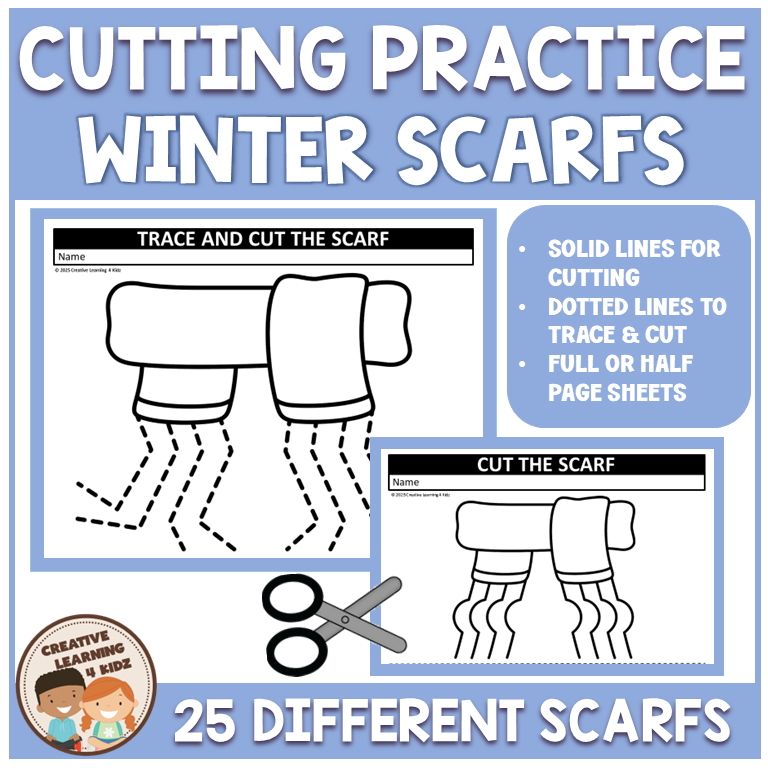 Kids will love trimming and styling the scarf’s fringe, making it wavy, zigzagged, or curly! With solid lines for direct cutting and dotted lines for tracing first, these worksheets allow kids to practice at their own pace while enjoying a fun winter-themed activity.